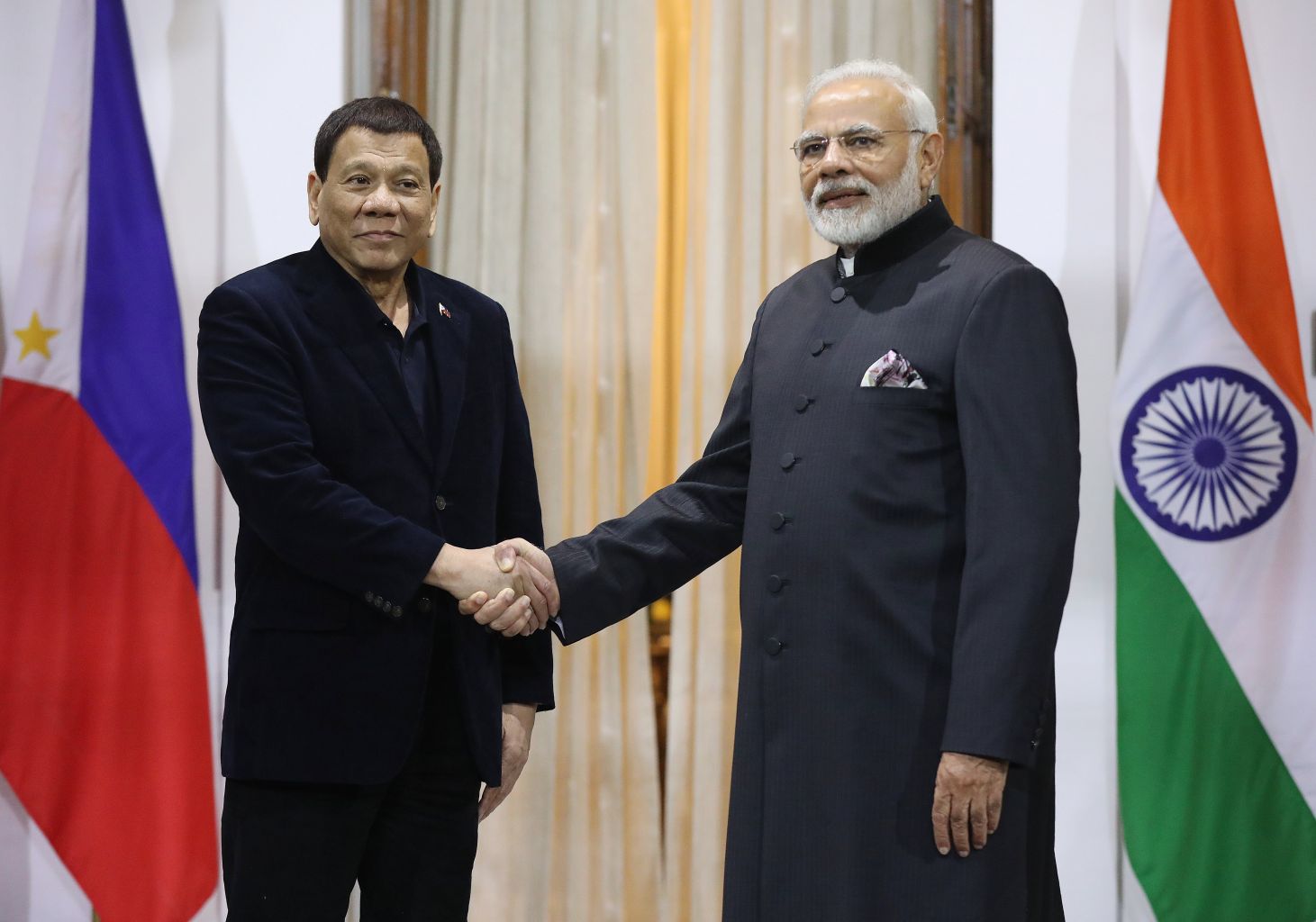Indian Prime Minister Narendra Modi (right) welcoming Philippine President Rodrigo Duterte on the sideline of the Asean-India summit in New Delhi on Jan 24, 2018.