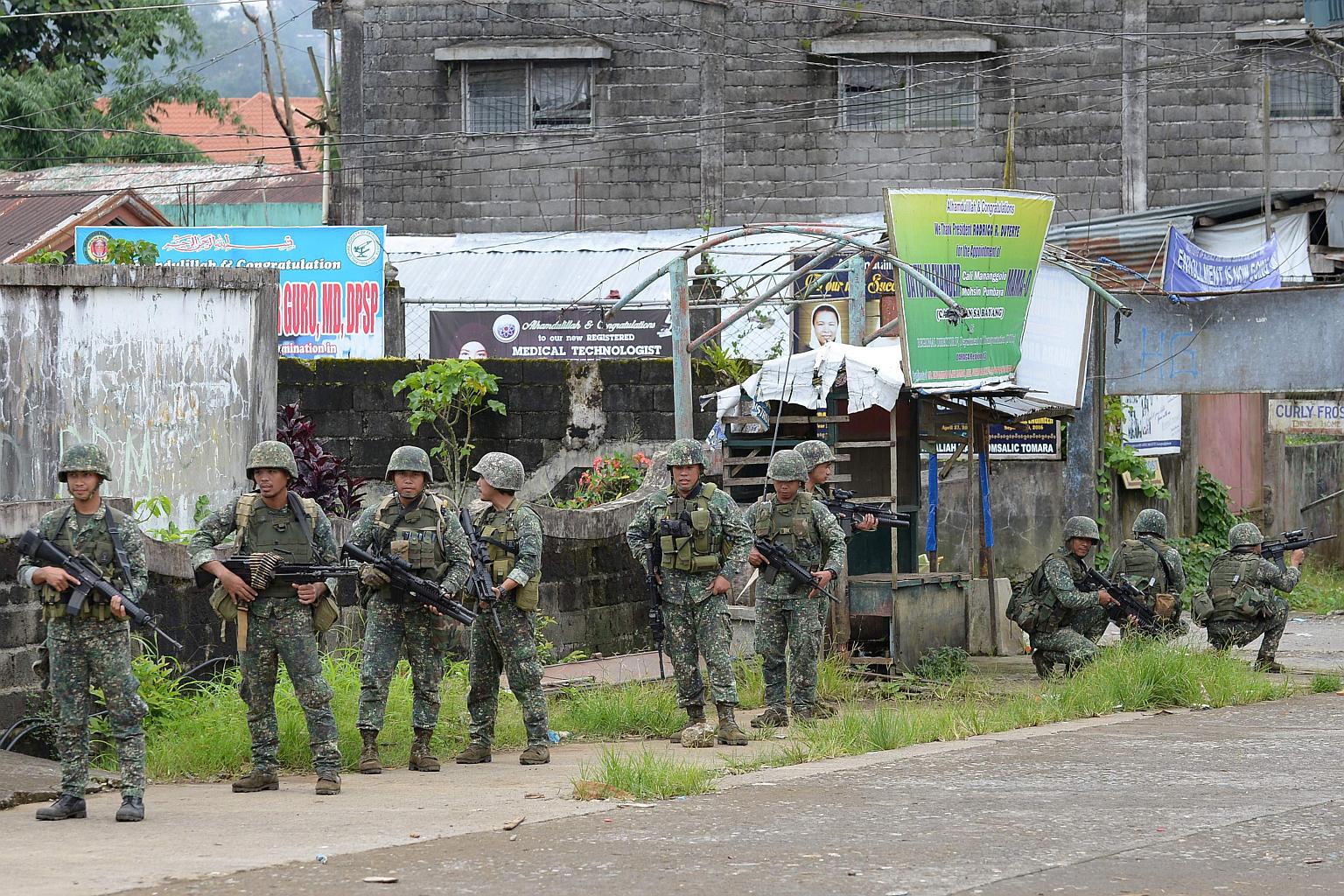 Philippine Marines patrolling a deserted street at the frontline in Marawi on the southern island of Mindanao, as fighting between government troops and Islamist militants enters its second month, on July 22, 2017.
