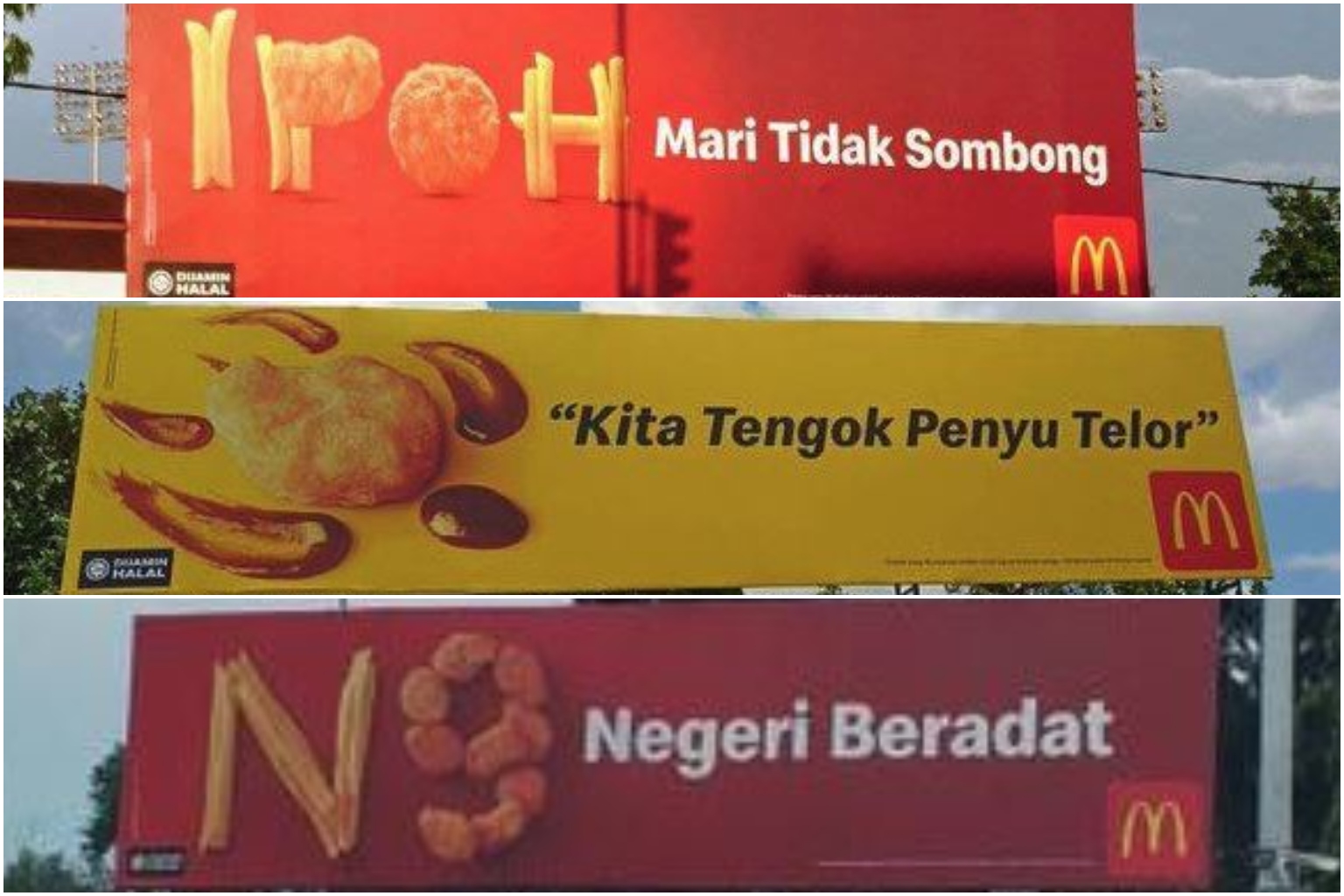 A post by Facebook page Buletin shows several of these billboards, including one in Penang which has the Penang Bridge made out of fries and the caption "Pulau Pinang Pulau Mutiara" (Penang, the Pearl of the Orient).