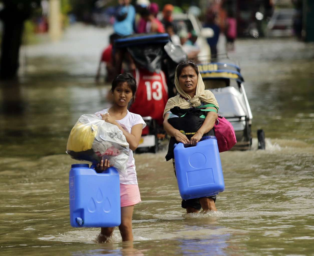 Filipino villages manoeuvre through flooded streets with their belongings.