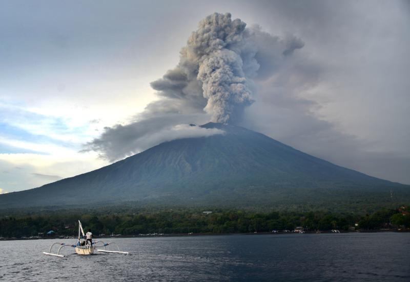 A fisherman steers a traditional boat as Mount Agung erupts, seen from the Kubu sub-district in Karangasem Regency on Indonesia's resort island of Bali on Nov 28, 2017.