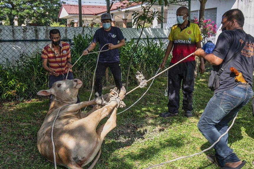 Malaysian Muslims tying up a cow ahead of its slaughter for Hari Raya Haji on July 20, 2021.