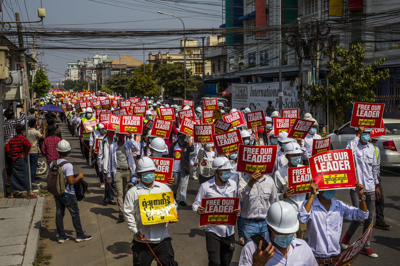 Medical students, doctors and engineers march in Yangon, Myanmar to protest against the military coup, on Feb 26, 2021.