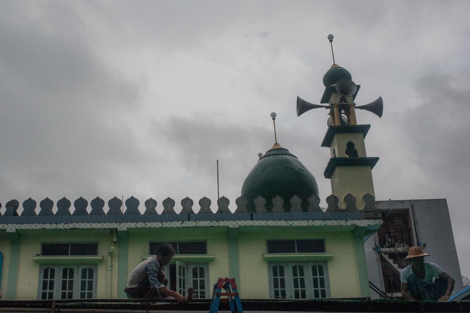 Men work on repairing the roof of a mosque in Yangon during the holy month of Ramadan on May 30 2017.