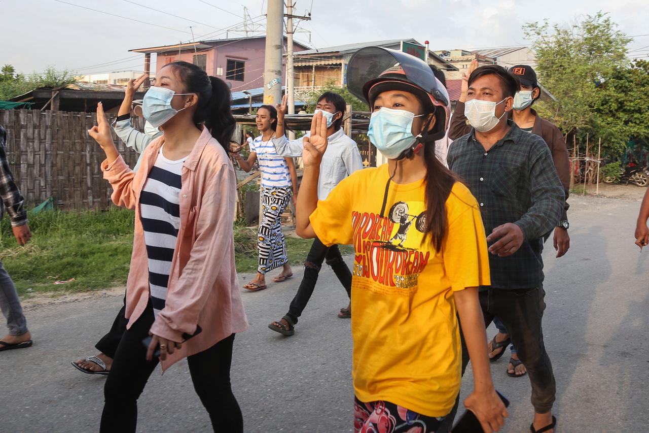 Demonstrators flash the three-finger salute as they march during an anti-coup protest in Mandalay on May 16, 2021.