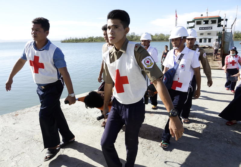 Members of Myanmar Red Cross society carry a wounded Rakhine ethnic man as they move injured people from a boat to Sittwe hospital in Myanmar's Rakhine state on May 2, 2019.