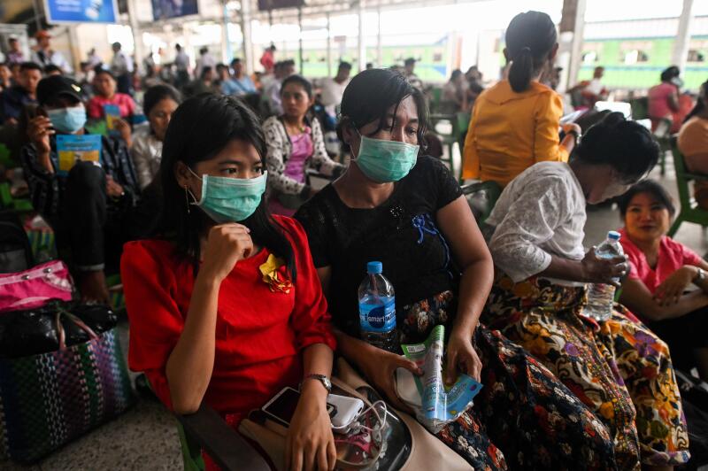 People wear face masks as a preventive measure against the Covid-19 coronavirus while waiting for a ride at the central railway station in Yangon, Myanmar, on March 19, 2020.