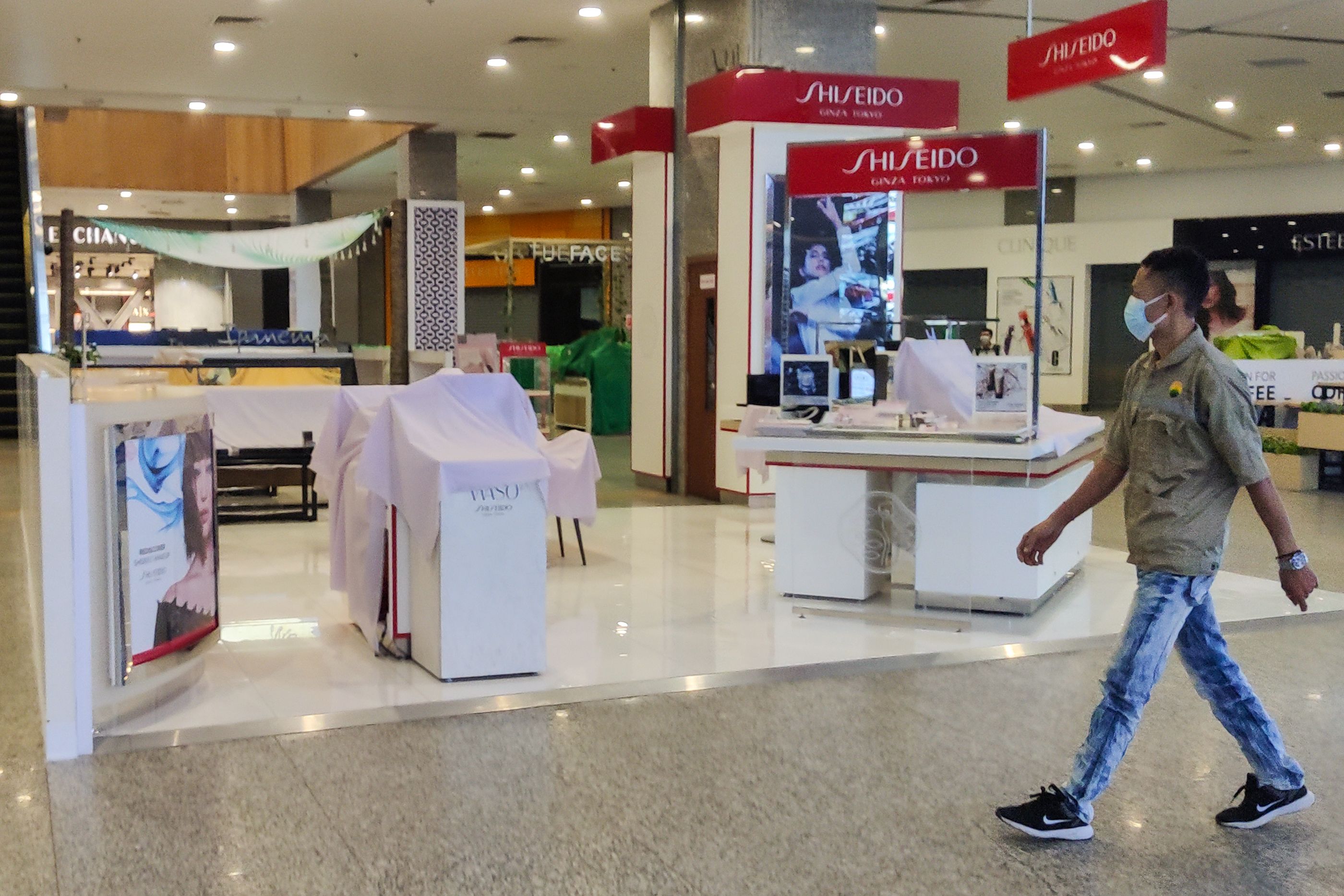 A closed cosmetics booth in a shopping centre in Yangon on Feb 1, 2021, after Myanmar's military seized power in a coup.