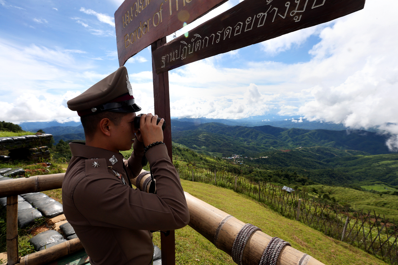 A Thai police officer in October 2019 surveying the vast landscape near the Thai-Myanmar border, where meth smugglers are known to infiltrate the porous Thai border.