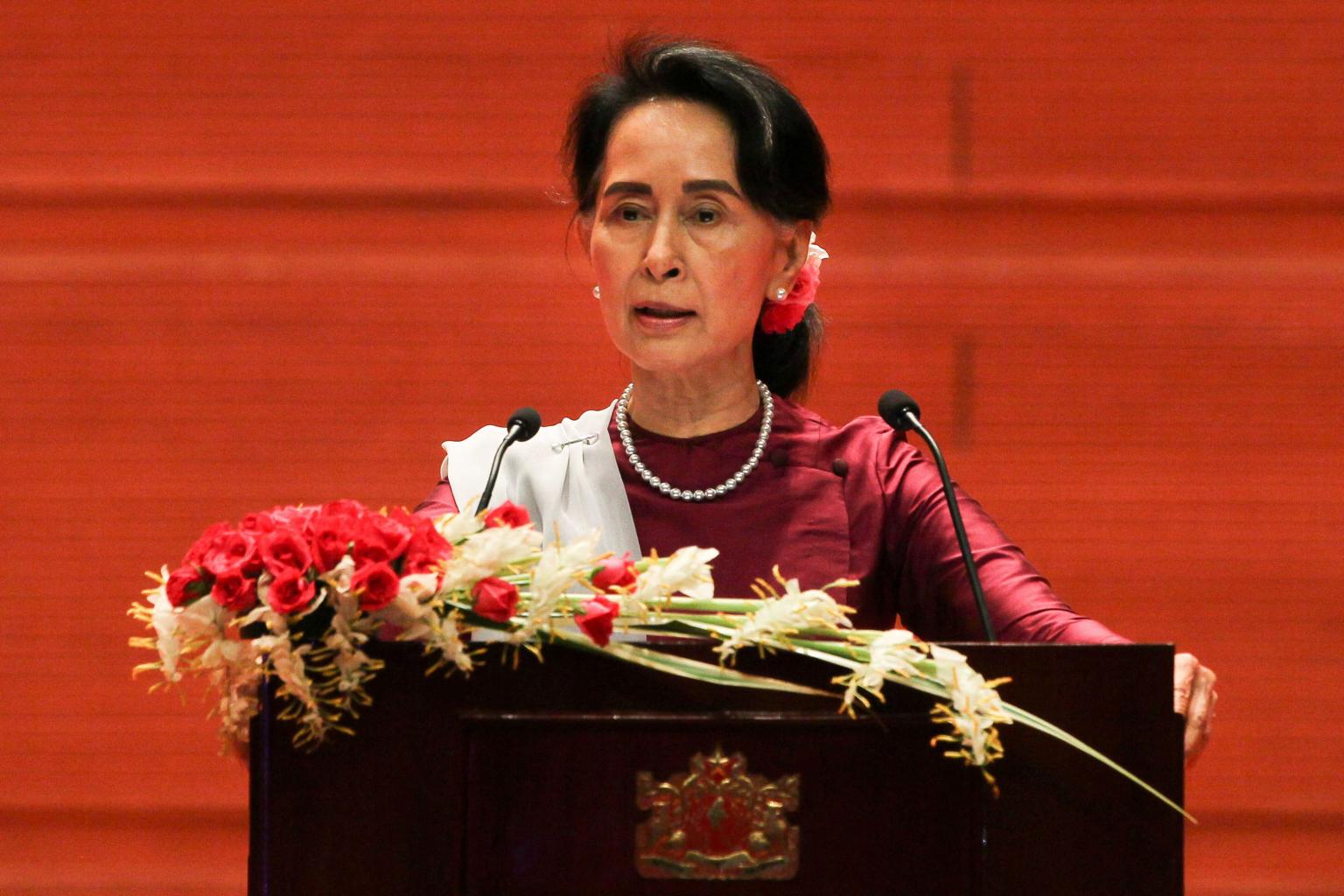 Ms Aung San Suu Kyi delivering a national address in Myanmar on Sept 19, 2017.