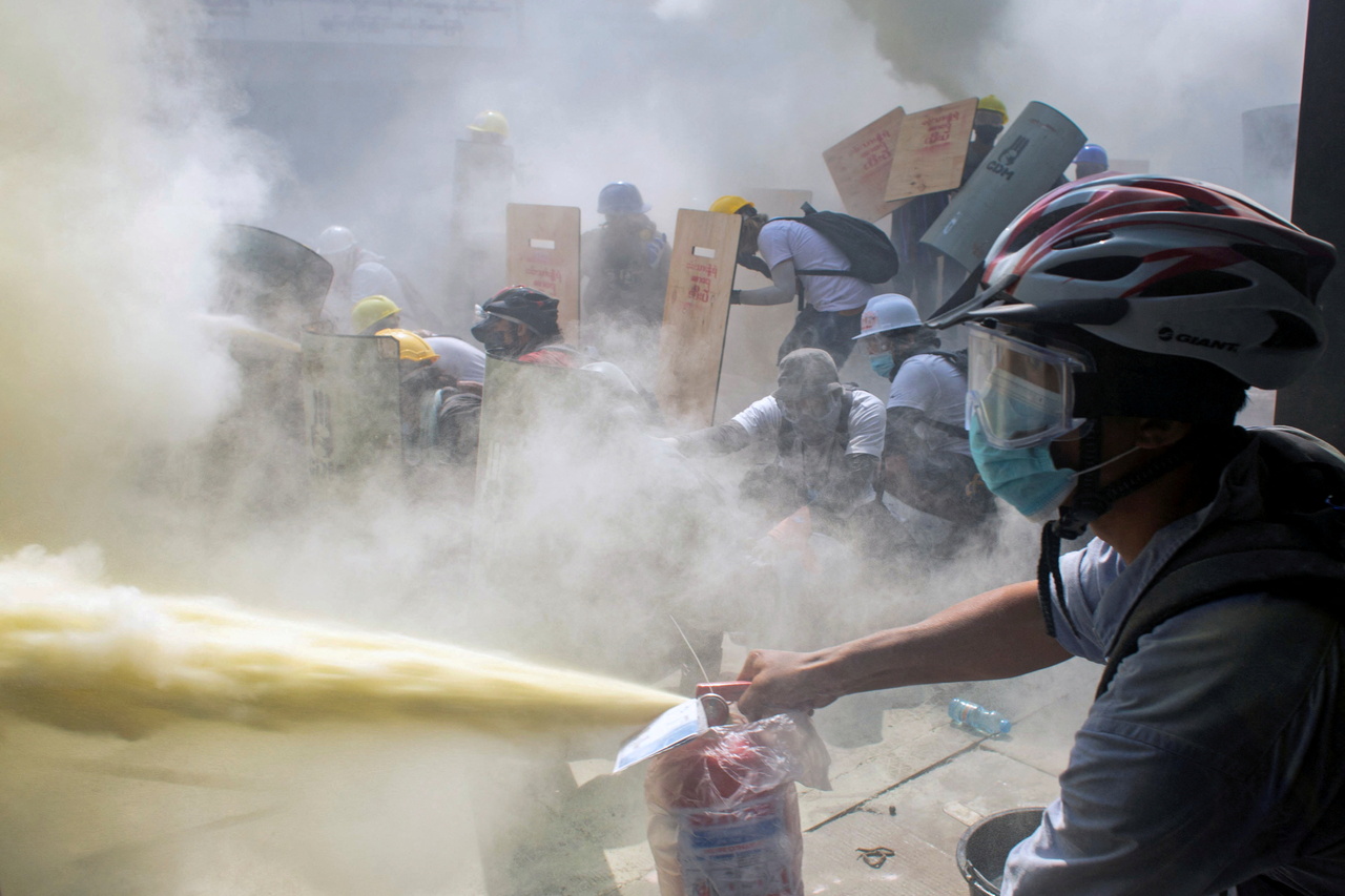A protester sprays a fire extinguisher as demonstrators clash with riot police officers in Myanmar on Feb 28, 2021.
