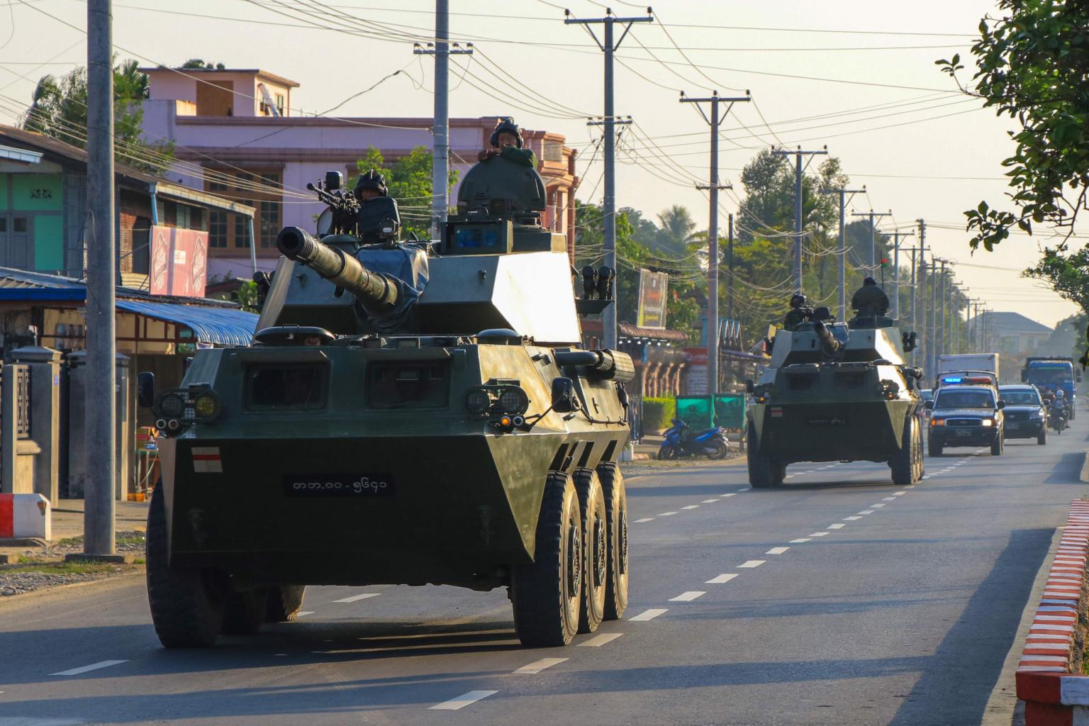 Soldiers ride in military armoured vehicles in Kachin state, Myanmar, on Feb 3, 2021.