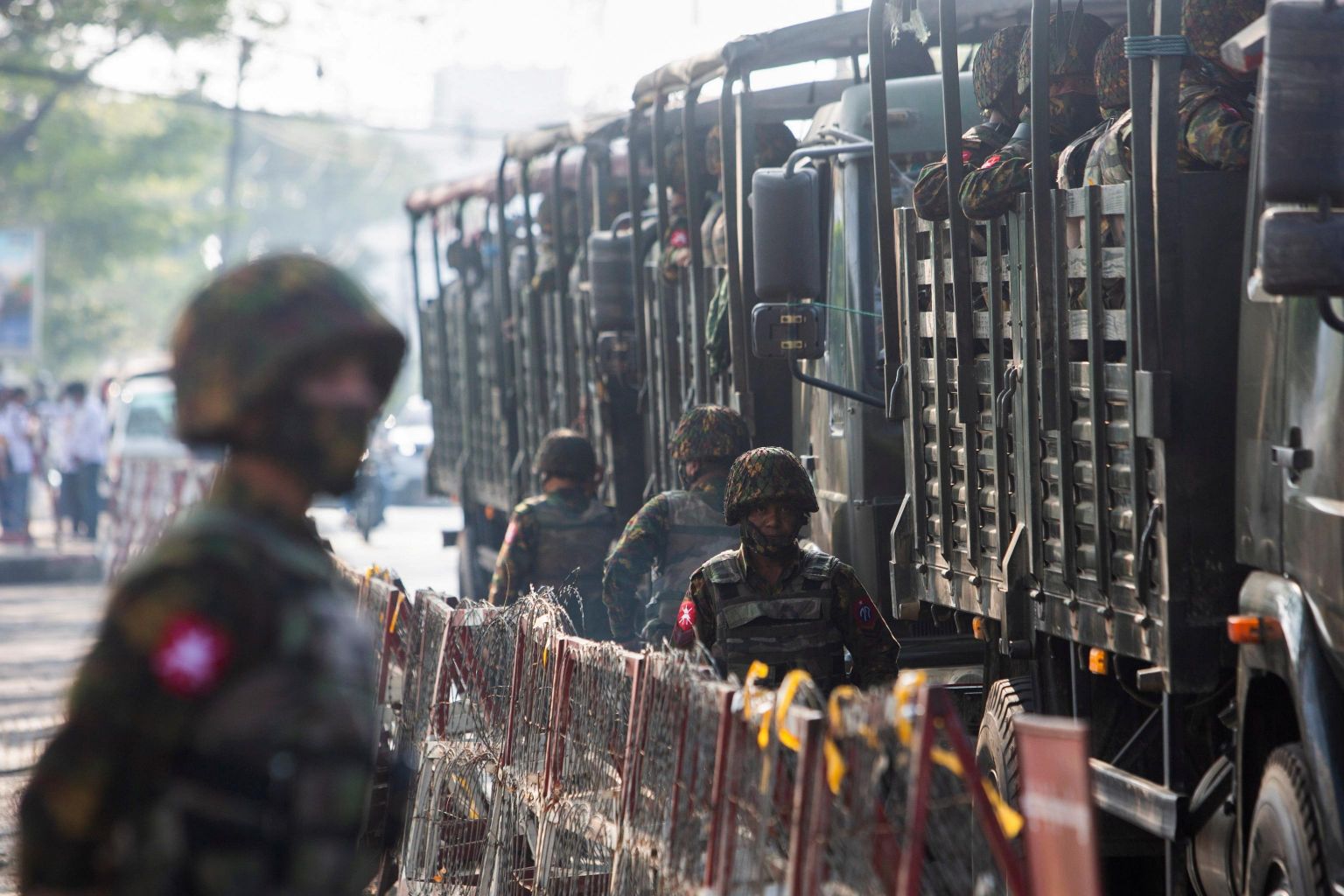 Soldiers stand next to military vehicles as people gather to protest against the coup in Yangon, Myanmar, on Feb 15, 2021.