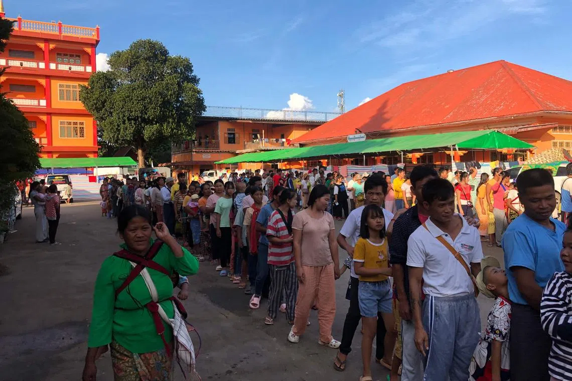 People queue for food at a monastery-turned-temporary shelter for internally displaced people in Lashio, Shan state.
