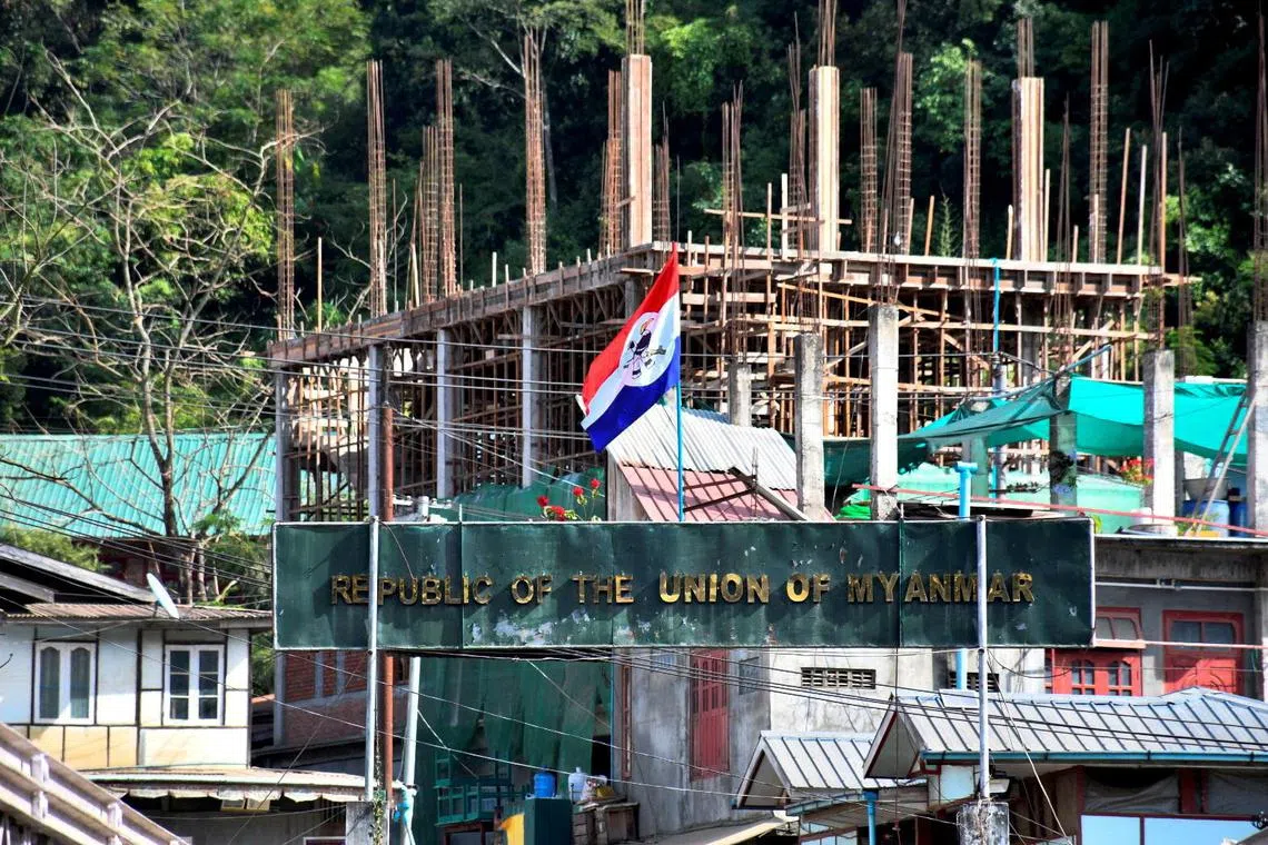 A flag of one of the Myanmar rebel forces is installed next to an under-construction structure in Myanmar’s Khawmawi village on the India-Myanmar border.