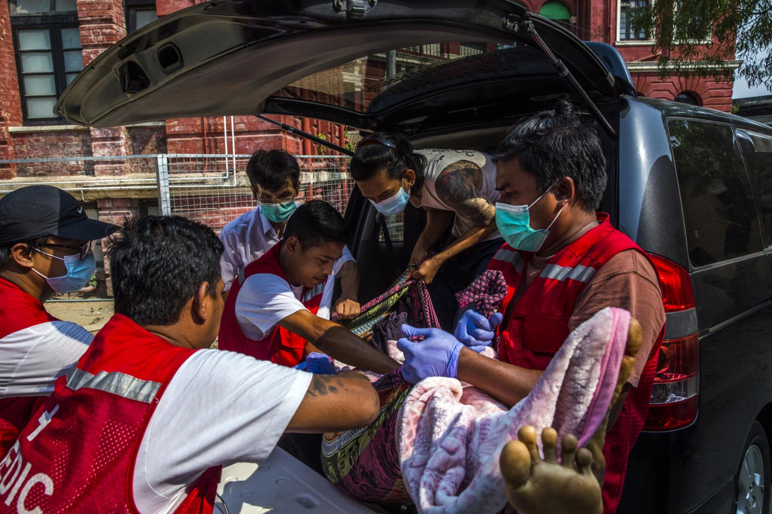 Volunteer medics unload the body of a student protestor who died after being shot during protests in Yangon, on March 27, 2021.