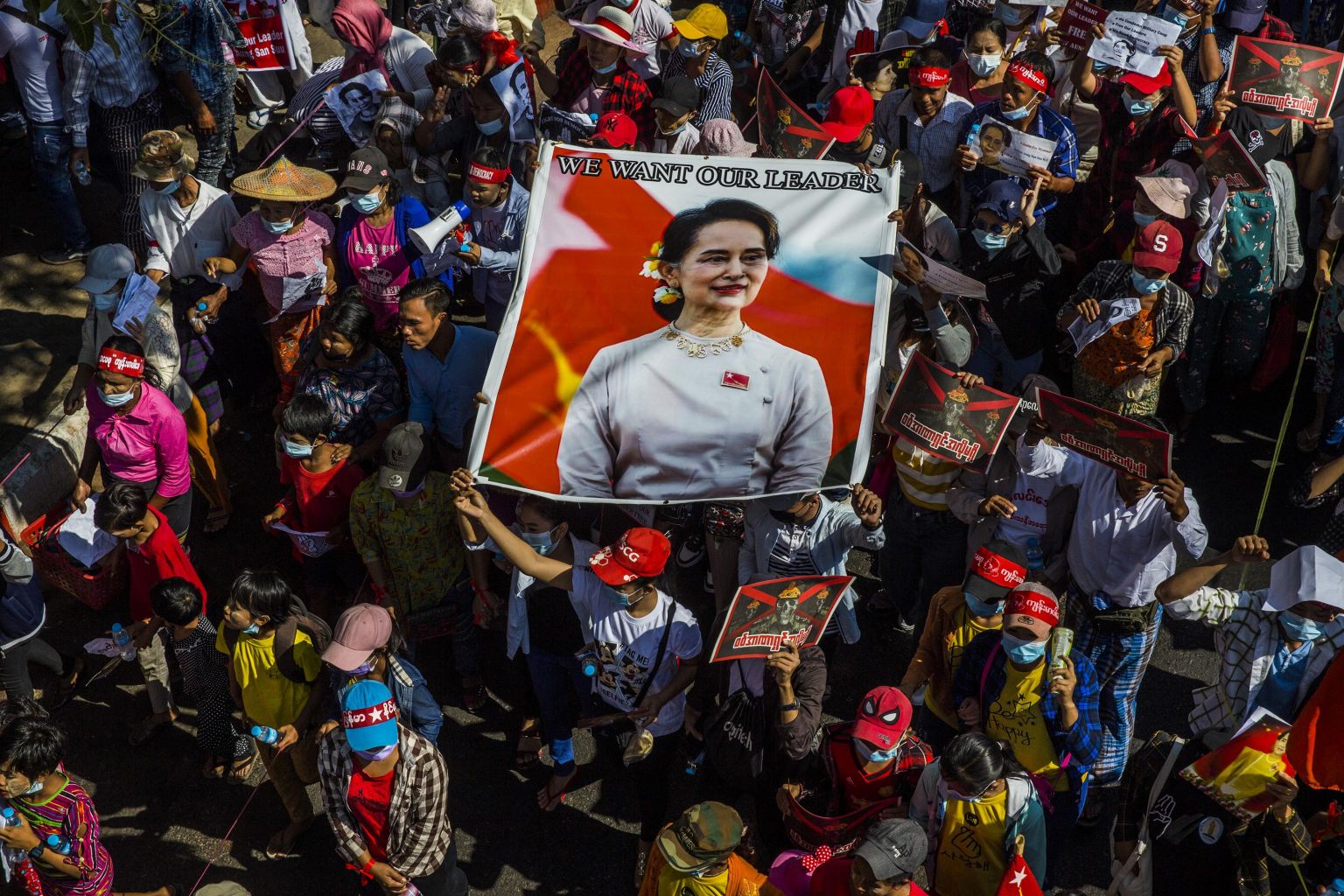 Demonstrators carry a banner of Aung San Suu Kyi during protests against the military coup in Yangon on Feb 13, 2021.