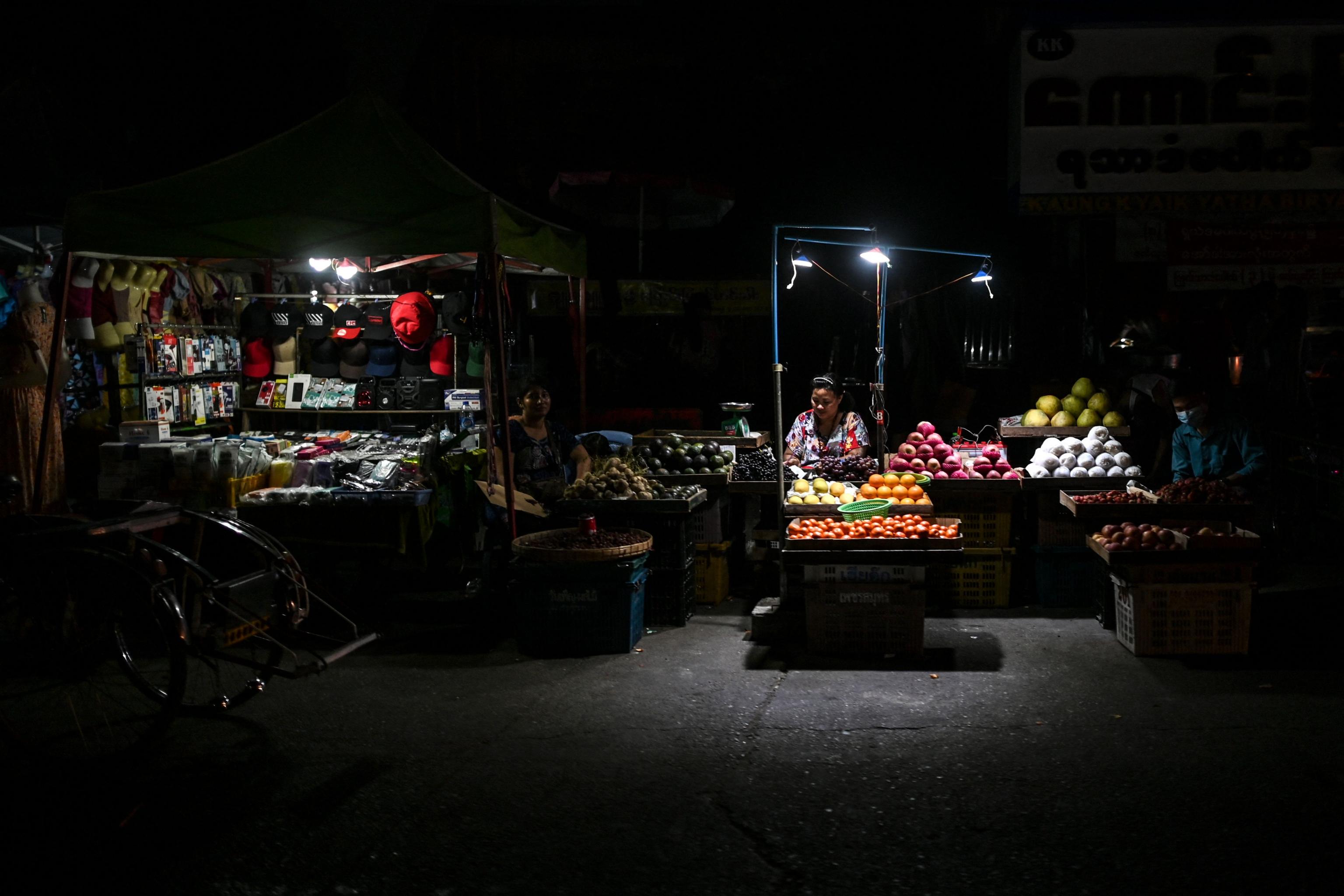 Street vendors wait for customers during a power outage in Yangon on March 3, 2022.