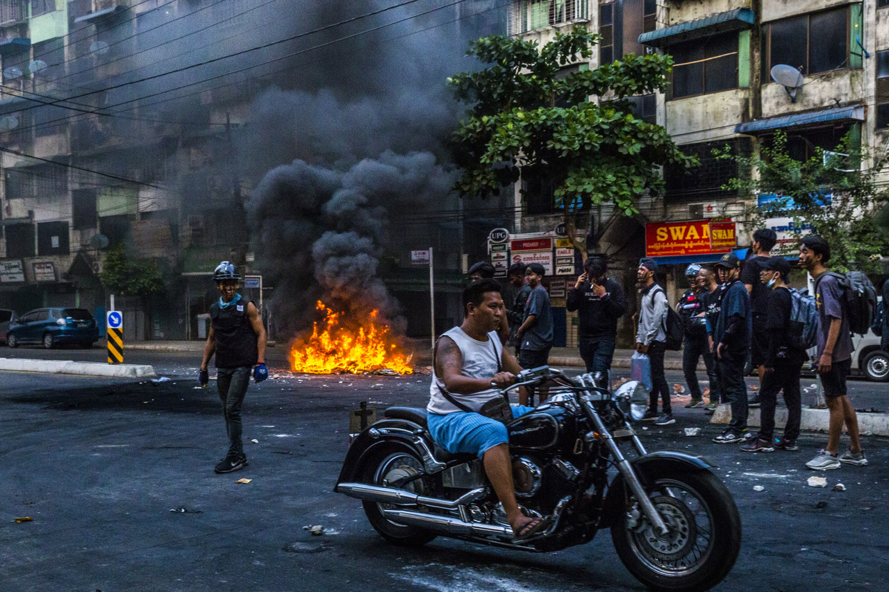 Protesters burn tires and trash in Yangon, Myanmar, on March 30, 2021.