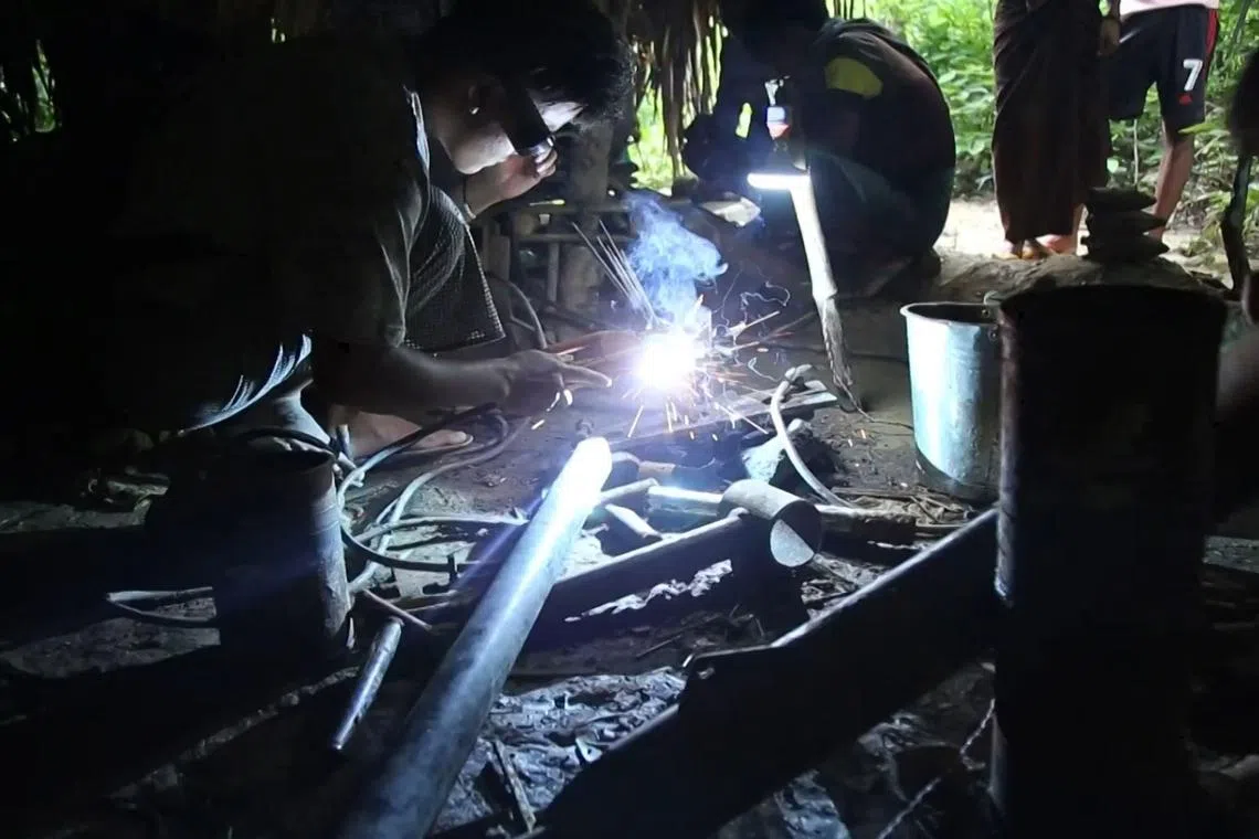 PALE, Myanmar - Under an awning in a bamboo thicket in northern Myanmar, an anti-coup fighter following instructions from YouTube welds scavenged steel into crude mortar rounds and shells to be fired at junta troops.