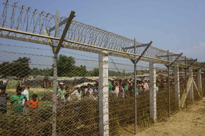 Rohingya Muslims gather behind Myanmar's border lined with barbed wire fences in Maungdaw district, located in Rakhine State bounded by Bangladesh, on March 17, 2018.