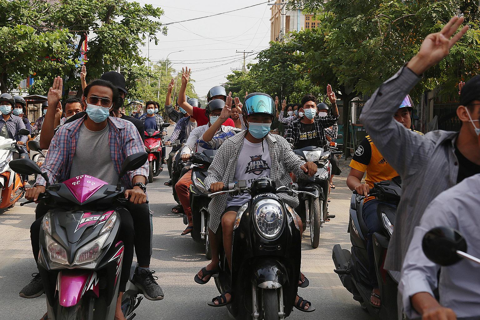 Demonstrators on motorcycles flash the three-finger salute during an anti-military coup protest in Mandalay, Myanmar, on April 15, 2021.