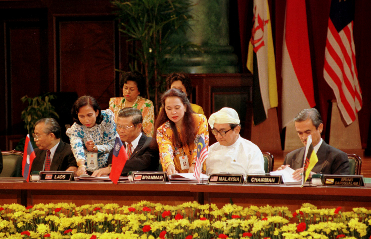 The foreign ministers of Laos and Myanmar signing a declaration admitting the two countries into Asean in 1997.