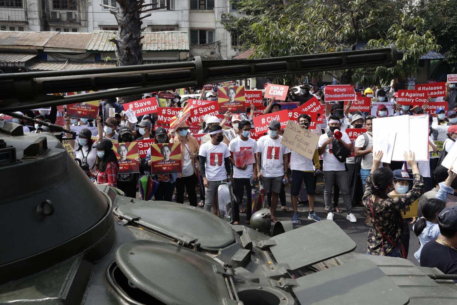 Demonstrators gather near a road where soldiers and armored vehicles are deployed during a protest outside the Central Bank of Myanmar in Yangon, on Feb 15, 2021.