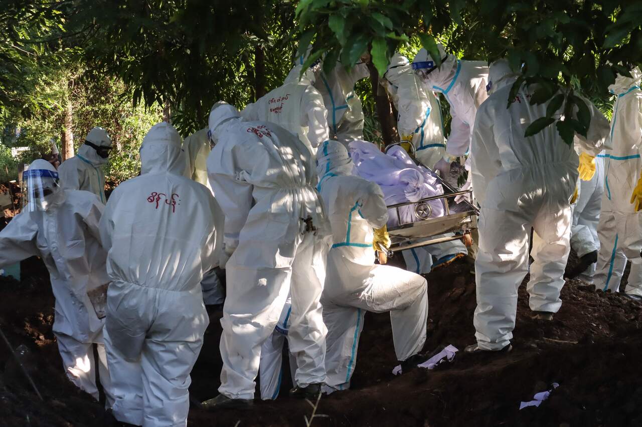 Volunteers prepare to bury the body of a Covid-19 victim during their funeral at a cemetery in Mandalay, Myanmar, on July 14, 2021.