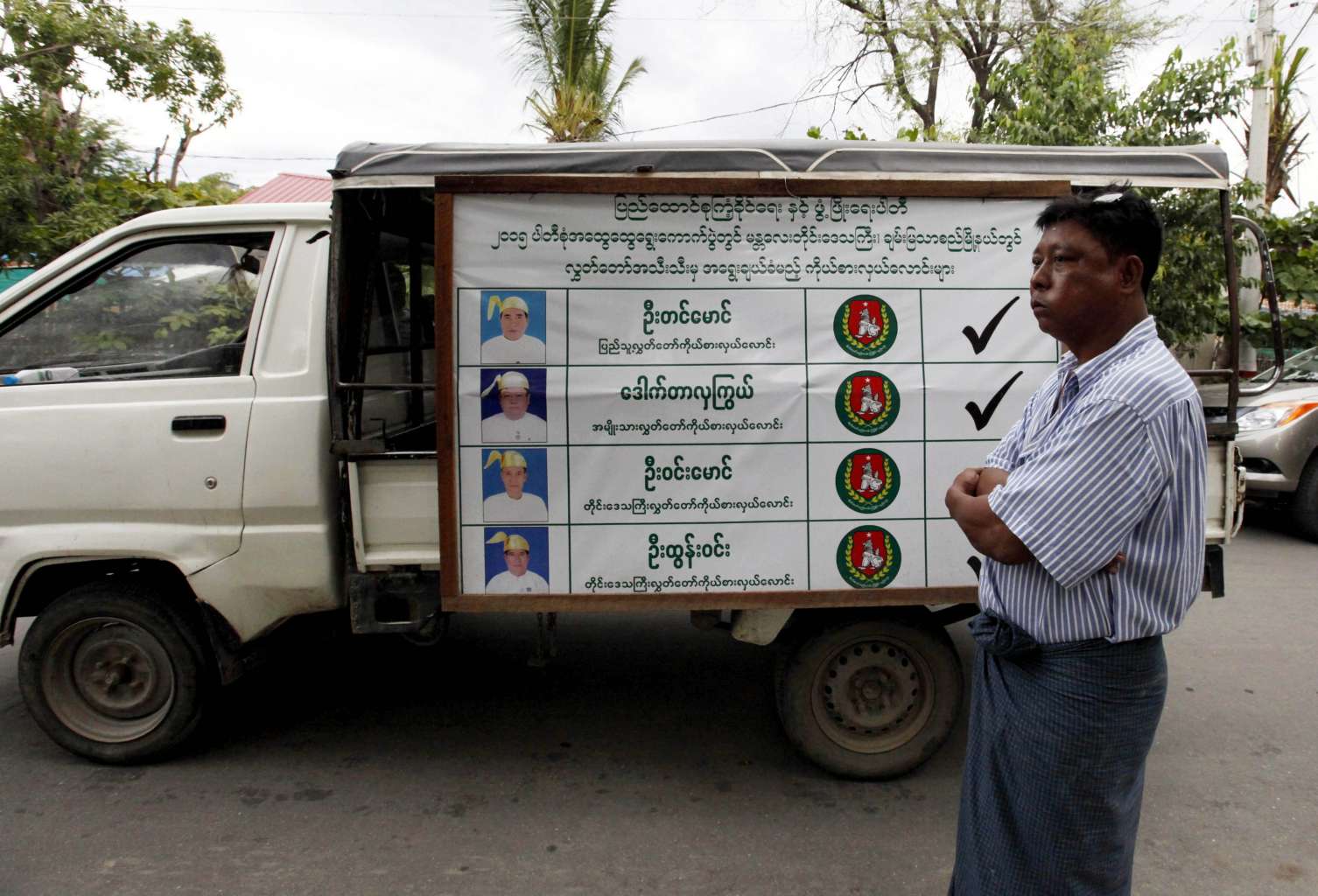 A man stands near campaign posters of the ruling Union Solidarity and Development Party (USDP) in Mandalay, Myanmar on Sept 18, 2015.