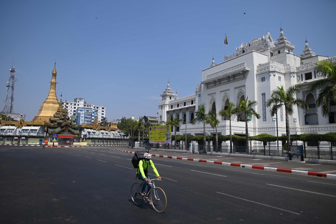 A man cycles along an empty street on the first day of Myanmar's New Year in Yangon on April 12, 2020.