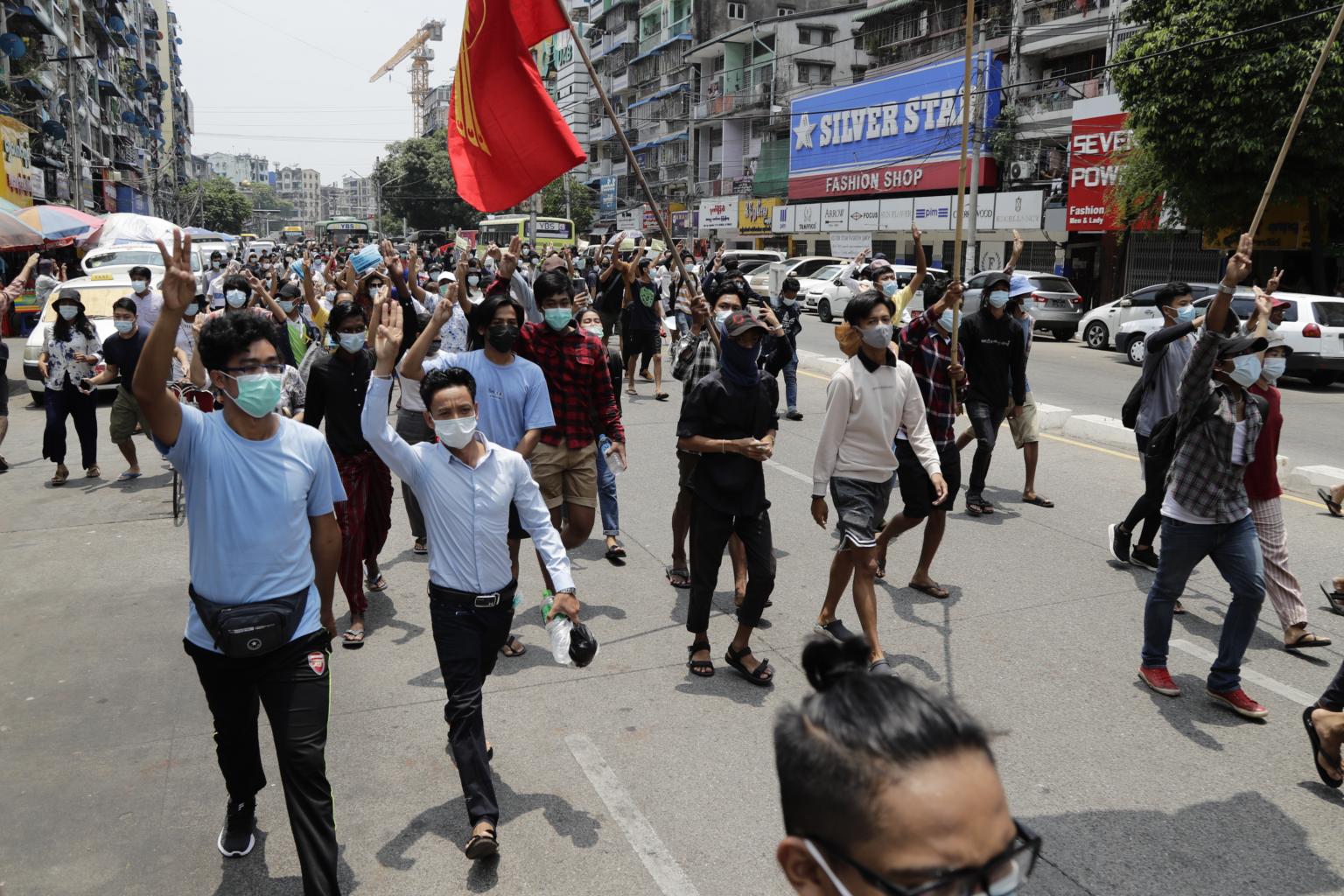 Demonstrators flash three-fingers salutes as they march during an anti-military coup protest in Yangon, Myanmar, on April 26, 2021.