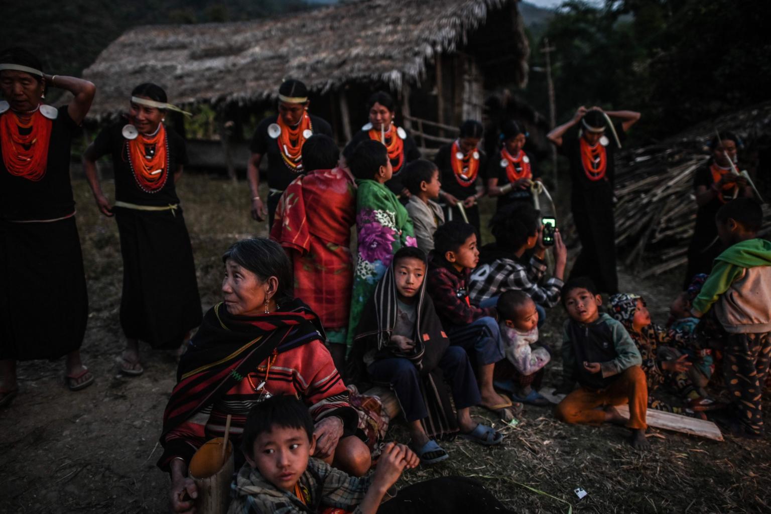 A photo taken on Feb 7, 2020, shows villagers watching the end of an overnight ceremony to bless the harvest by Naga tribeswomen in Satpalaw Shaung village, Lahe township in Myanmar's Sagaing region.