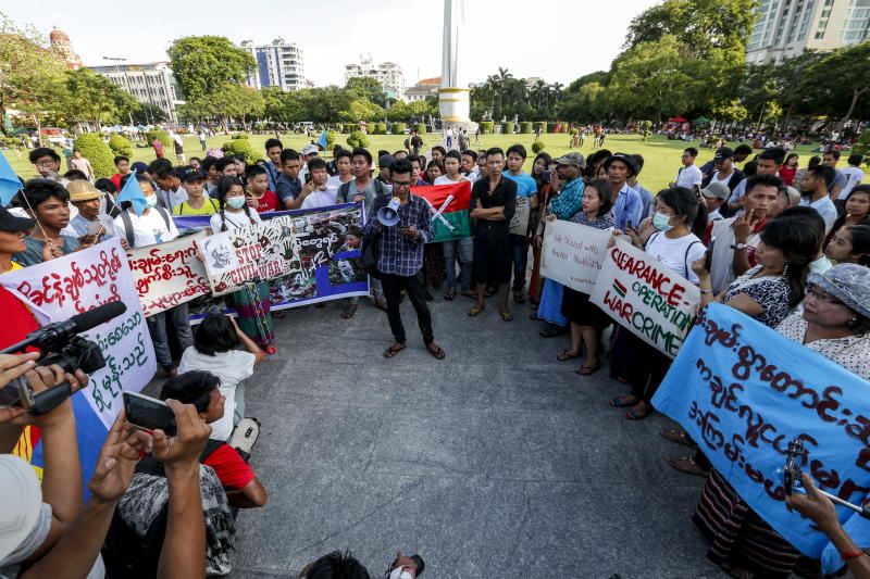 People hold posters and placards during the demonstration against recent clashes at Kachin State in Yangon, Myanmar, on May 6, 2018.