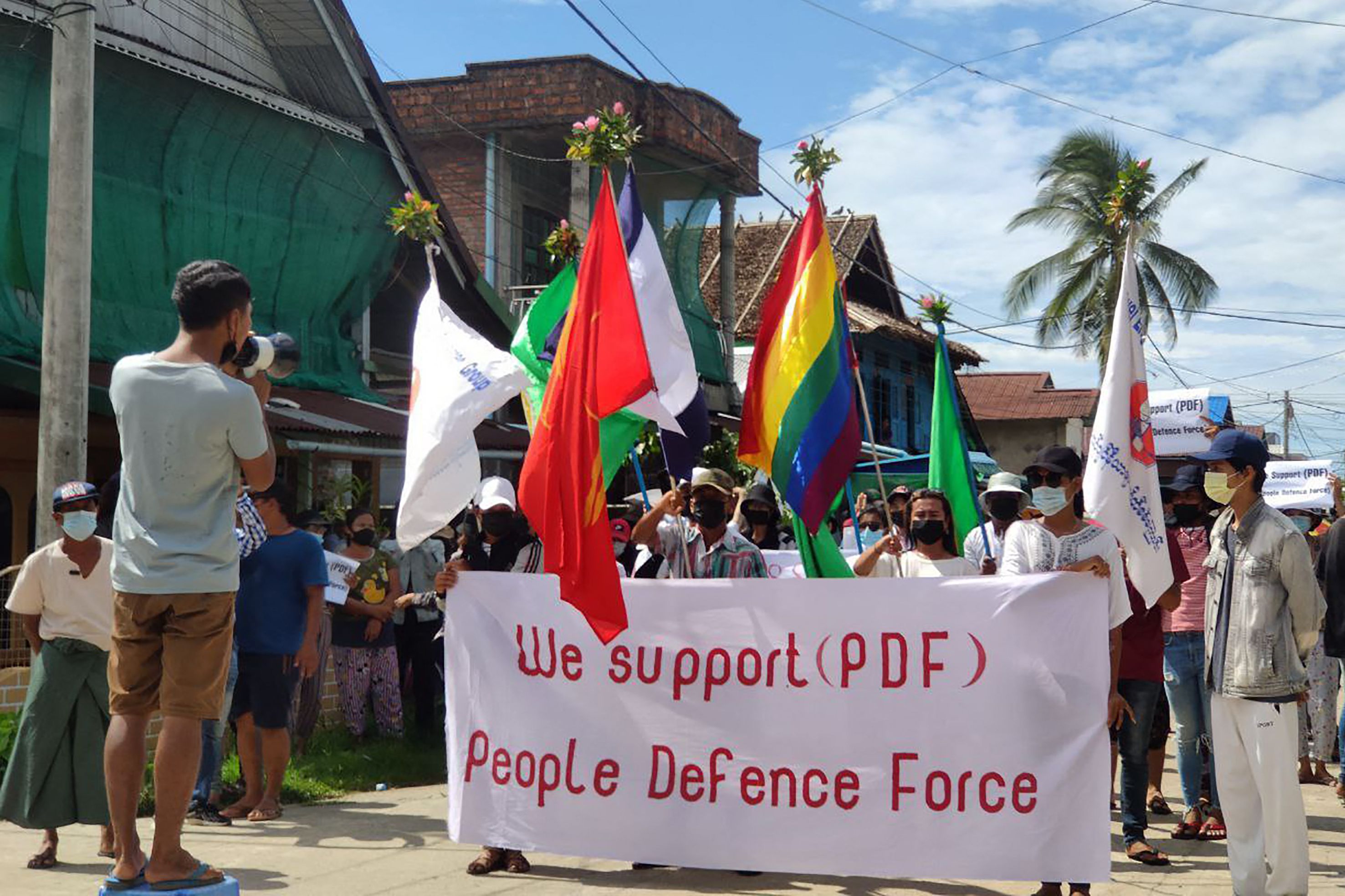 In a photo taken on May 7, 2021, protesters hold up a banner supporting the People's Defence Force during a demonstration against the military coup in Dawei.