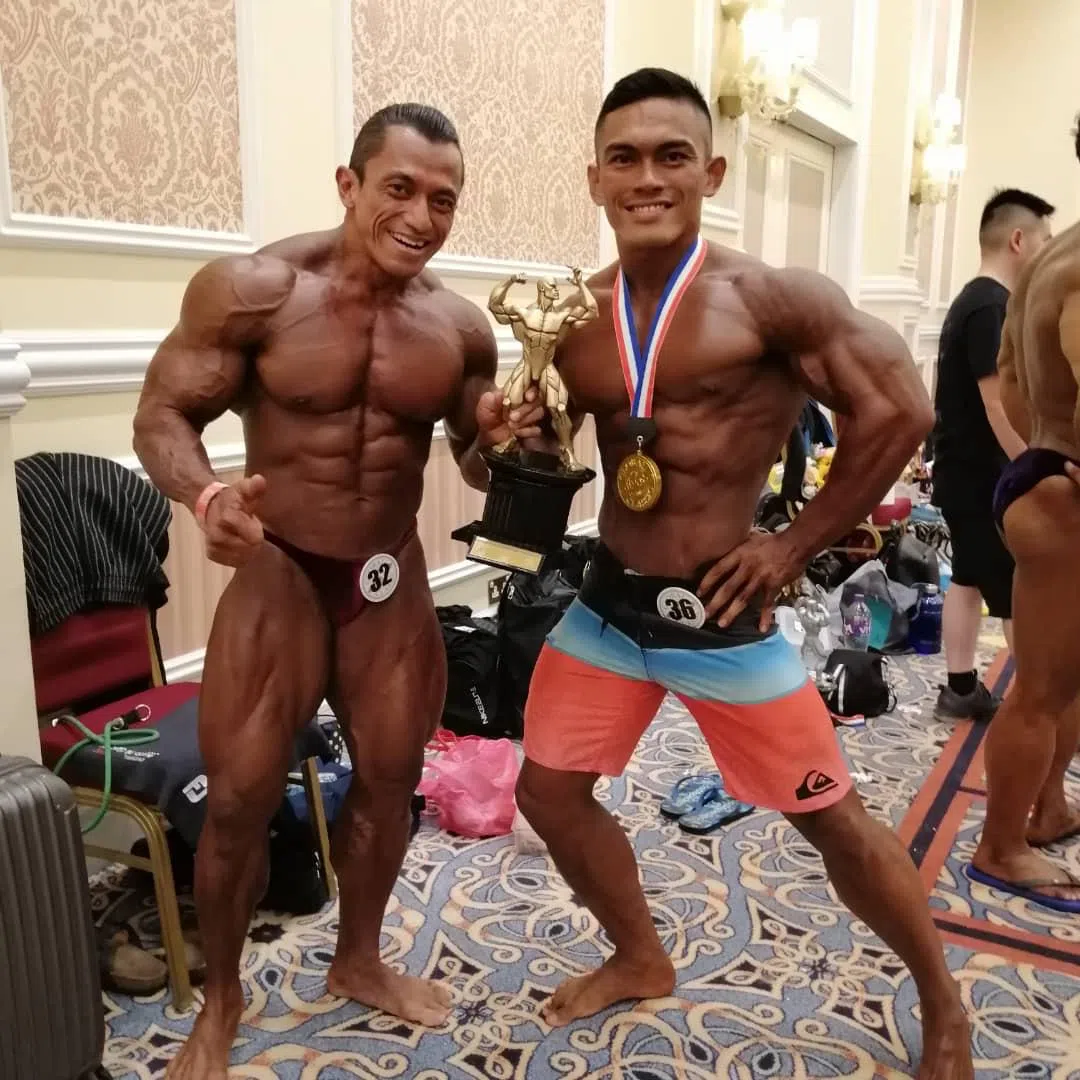 Mr Amir Syarifuddin Suhaimi (right) with 10-time Mr Universe bodybuilding champion Sazali Samad.