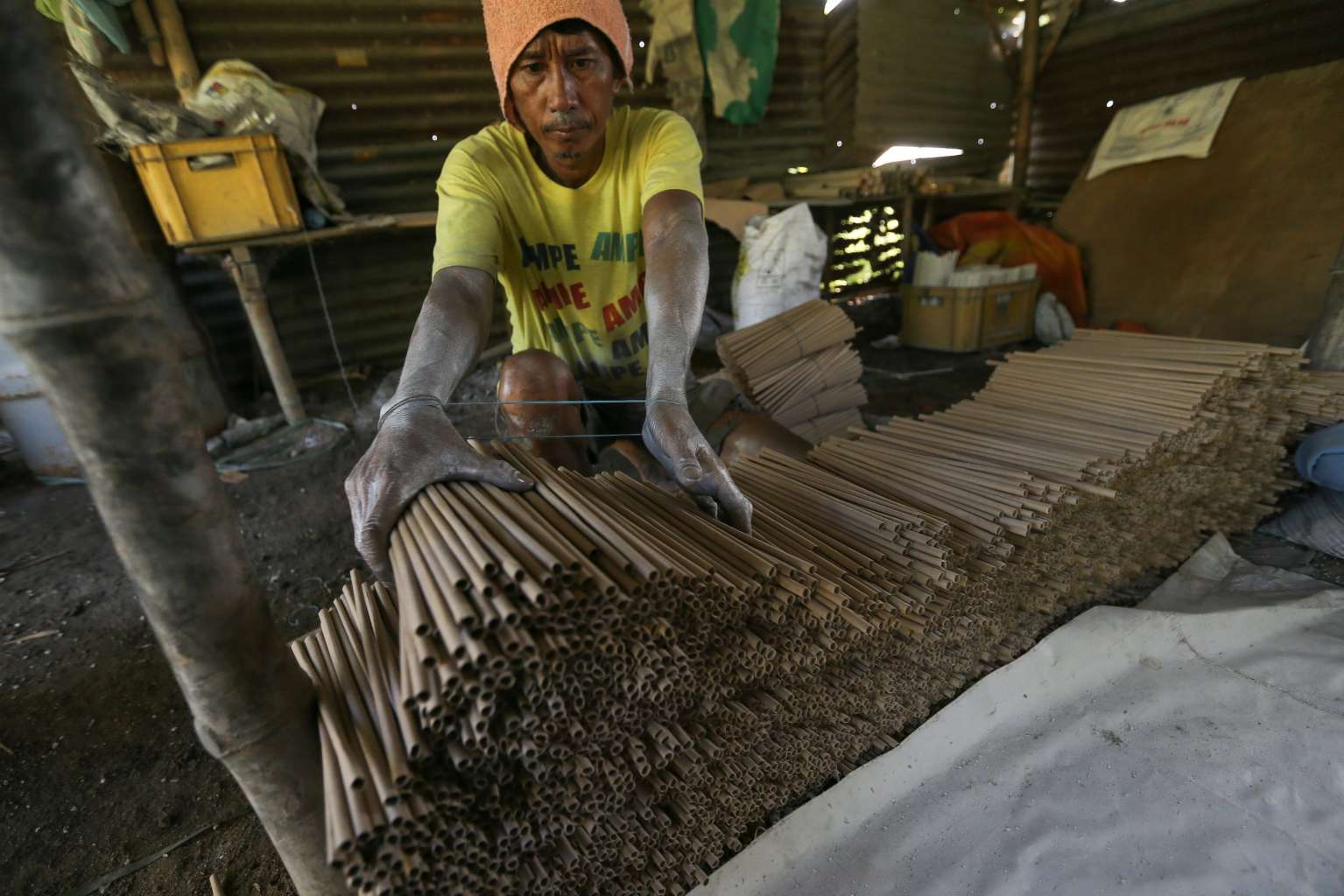 A Filipino worker preparing firecrackers inside a backyard factory in Bocaue, Bulacan, on Dec 27.