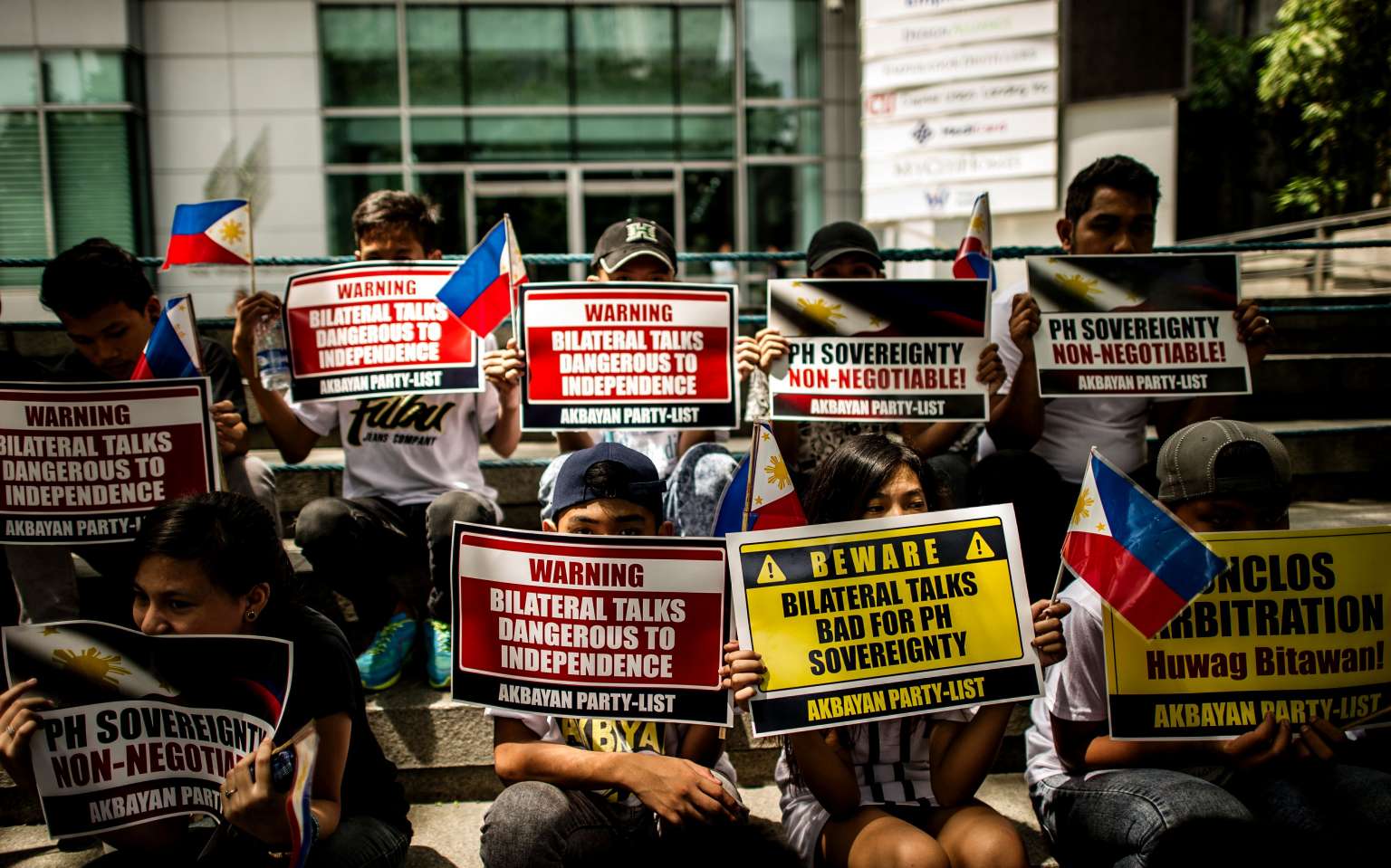 Activists hold a protest in front of the Chinese Consular Office in Manila on June 10, 2016.