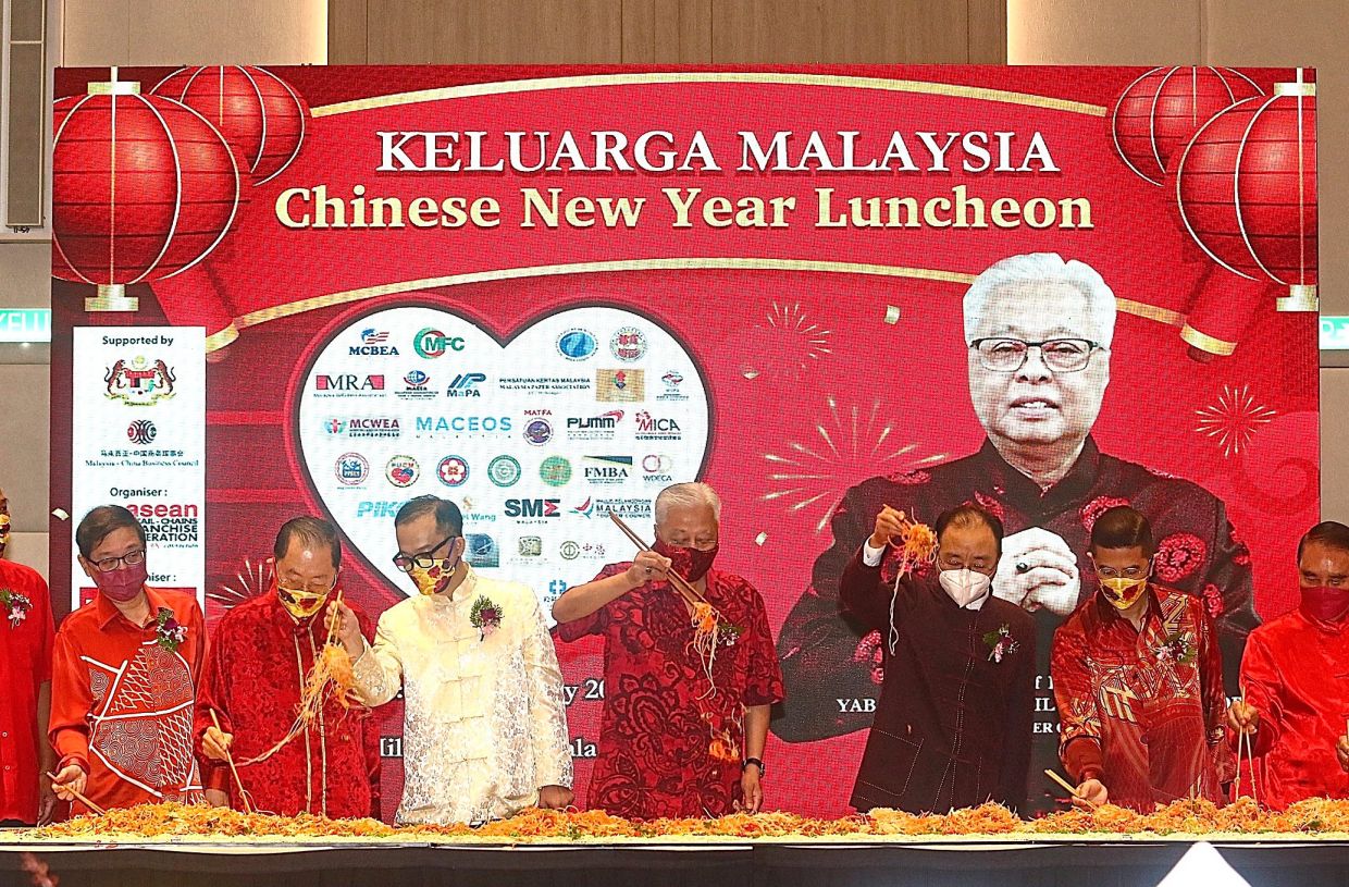 Prime Minister Ismail Sabri Yaakob (fourth from right) at a Keluarga Malaysia Chinese New Year luncheon on Feb 13, 2022.