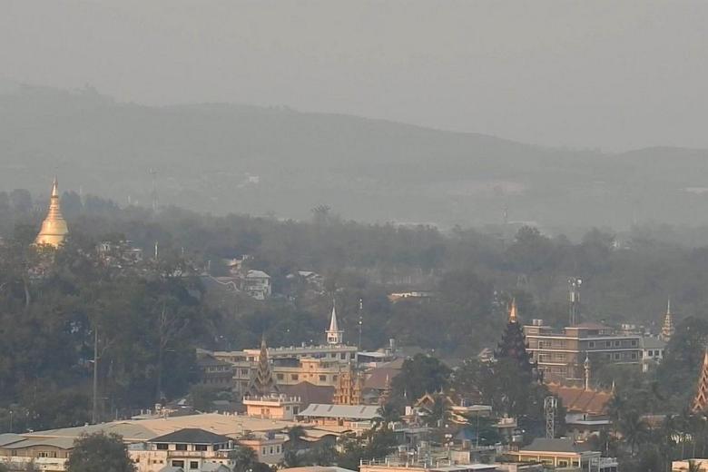 A view from the Mae Sai District Health Office on Monday (March 12) shows the city in Chiang Rai enveloped in haze, with the day’s PM2.5 particulate level peaking at 128mcg, well beyond the Thai safety limit of 50mcg.
