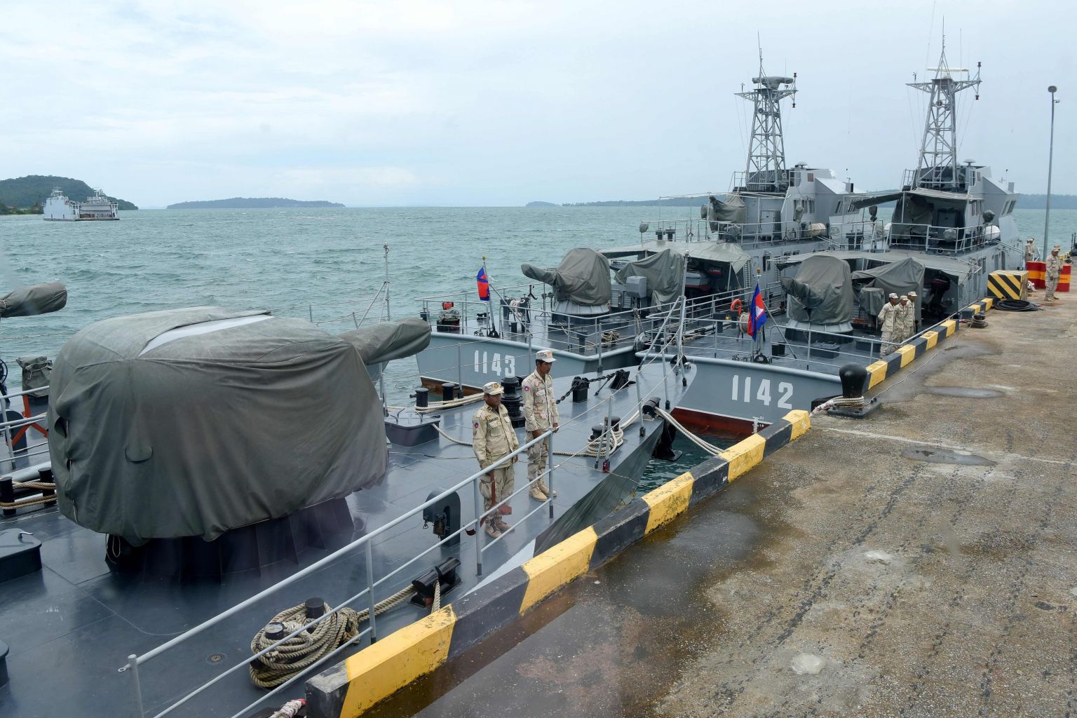 Cambodian naval personnel are seen on boats berthed at a jetty at the Ream naval base in Preah Sihanouk province on July 26 during a government-organised media tour.
