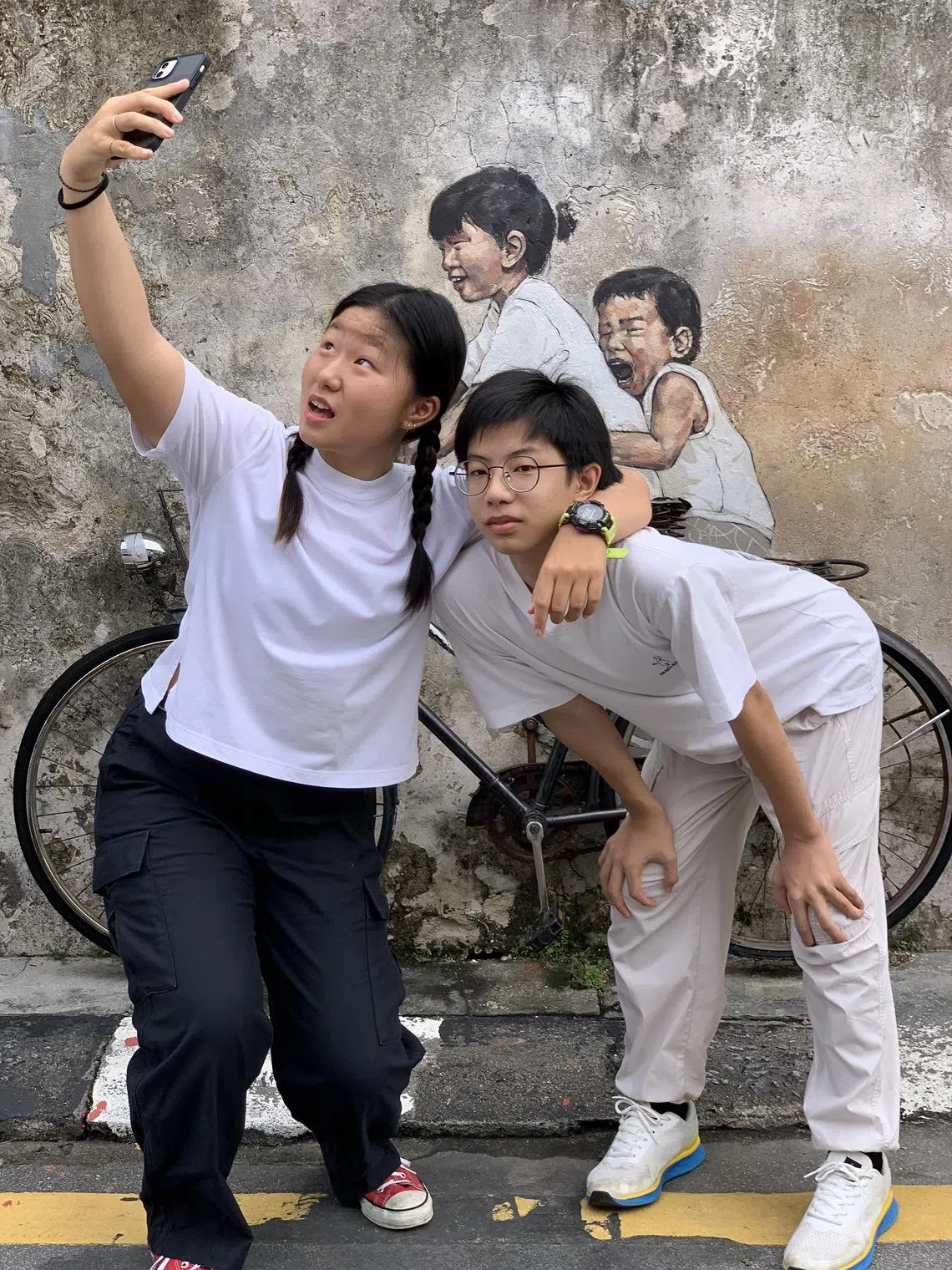 Siblings Tan Yi (left) and Tan Kern taking a wefie in front of the Children On A Bicycle mural.