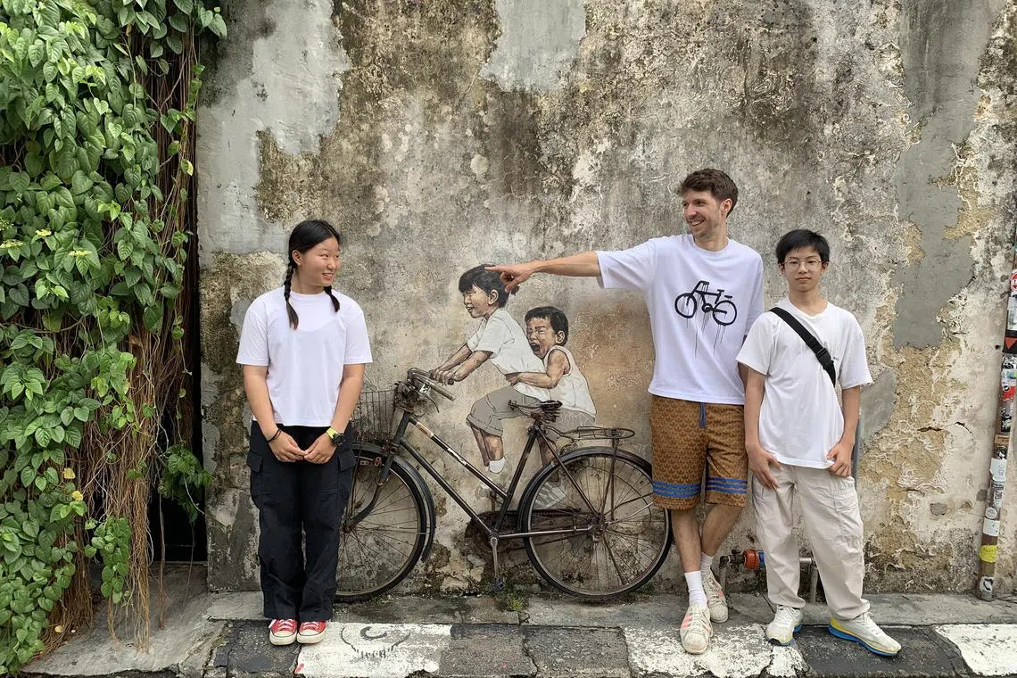 Lithuanian artist Ernest Zacharevic with (from left) siblings Tan Yi and Tan Kern, and Mr Mohammad Shahrul Aiman Mohamed, in Penang.