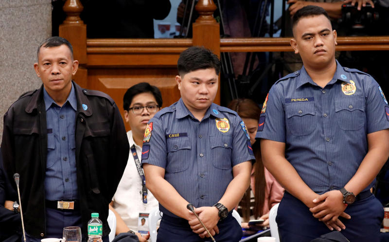 Police officers suspected of killing 17-year-old Kian delos Santos stand during a senate hearing in Pasay, Philippines, on Sept 5, 2017.
