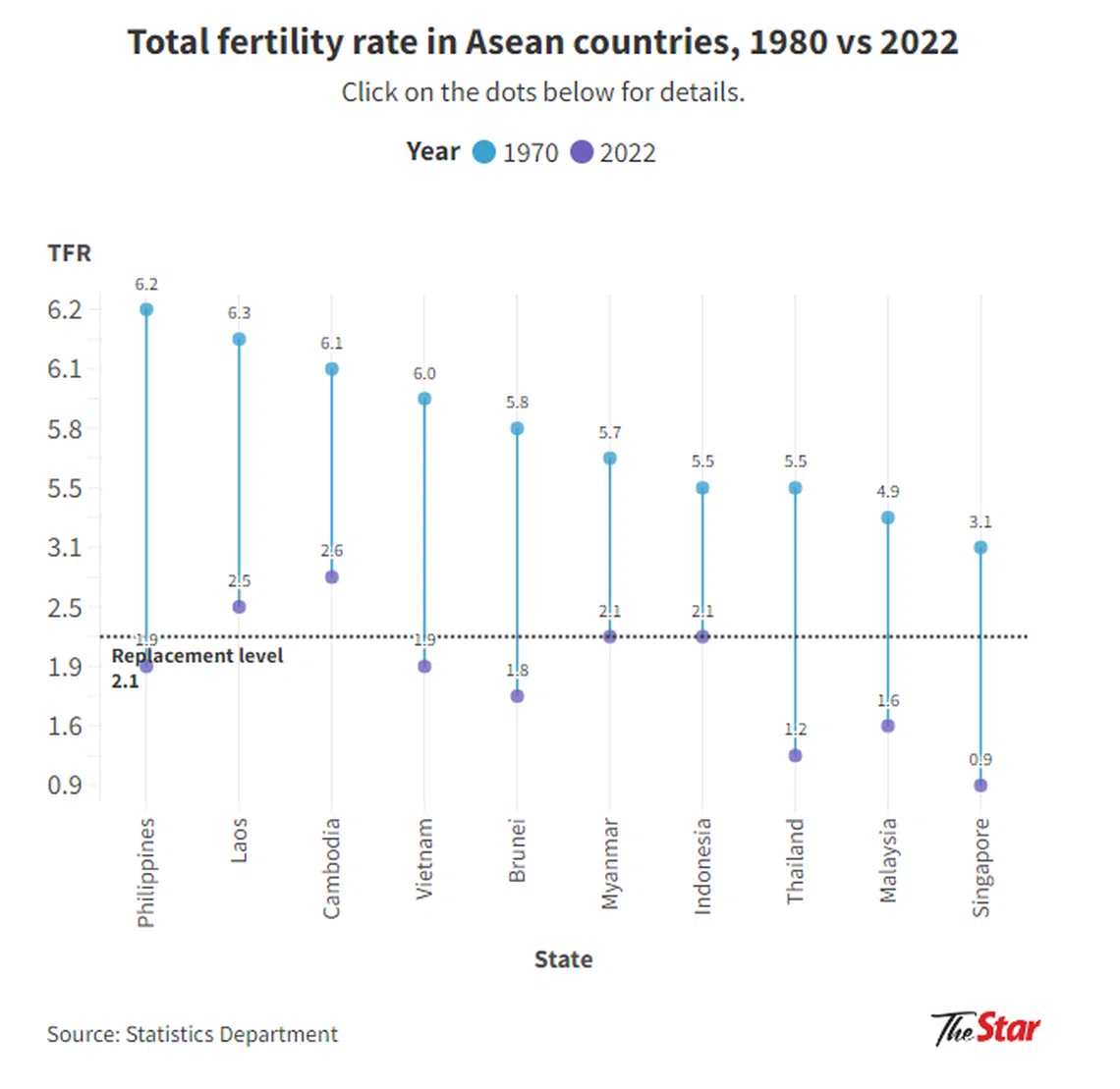 Among Asean countries, Malaysis has the third-lowest TFR, after Singapore and Thailand.