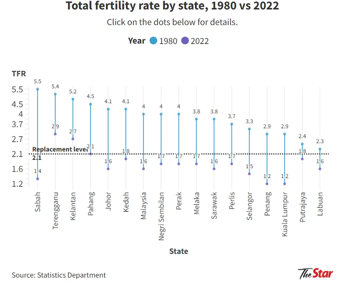According to the Statistics Department, 13 states and federal territories have total fertility rates (TFRs) that have dropped below the replacement level of 2.1 babies for every female aged 15 to 49.