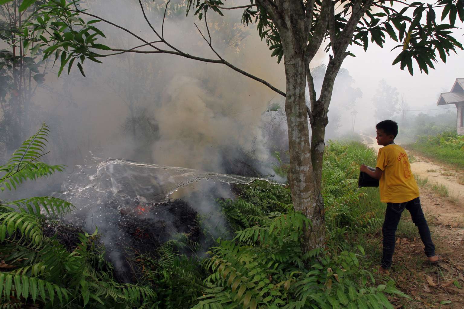 A boy in Pekanbaru tries to douse a fire with a bucket.