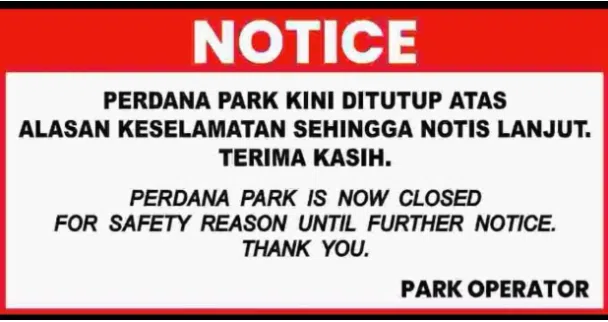 An image of a red and white notice by the park operator that reads “Perdana Park is now closed for safety reasons until further notice. Thank you.” has been circulating on social media. There was also an announcement by Kota Kinabalu City Hall.