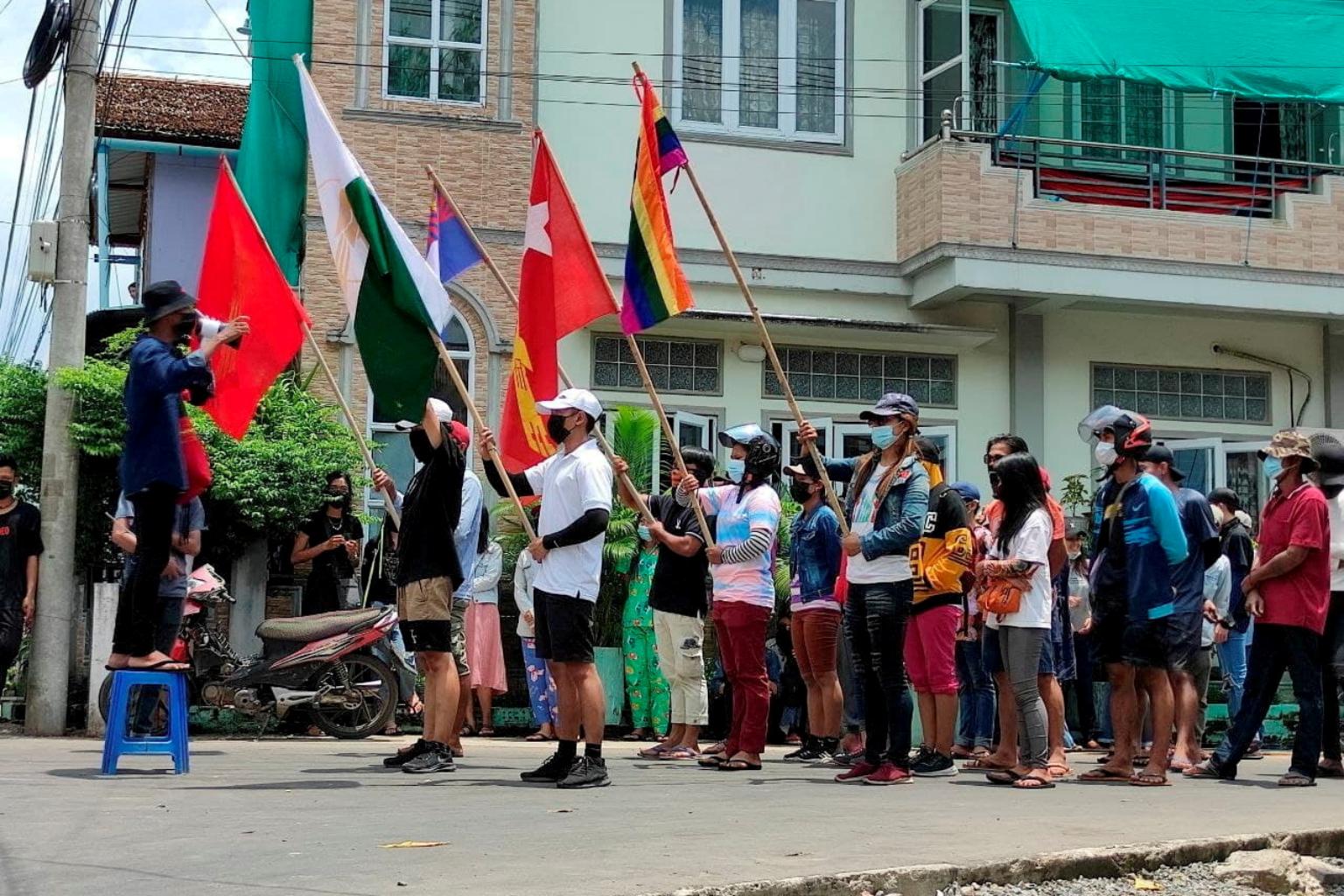 Demonstrators carry flags during a protest against the military coup in Dawei, Myanmar on April 27, 2021.