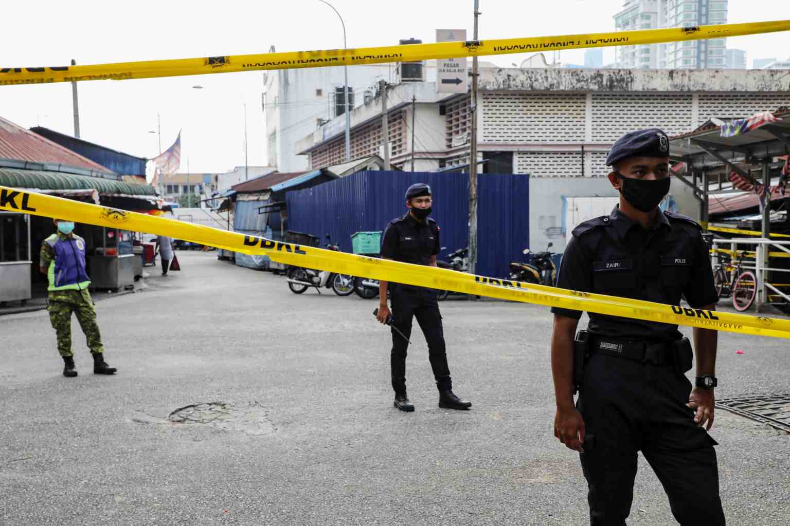 A photo taken on March 27, 2020 shows police officers at an entrance of a market during the movement control order in Kuala Lumpur.